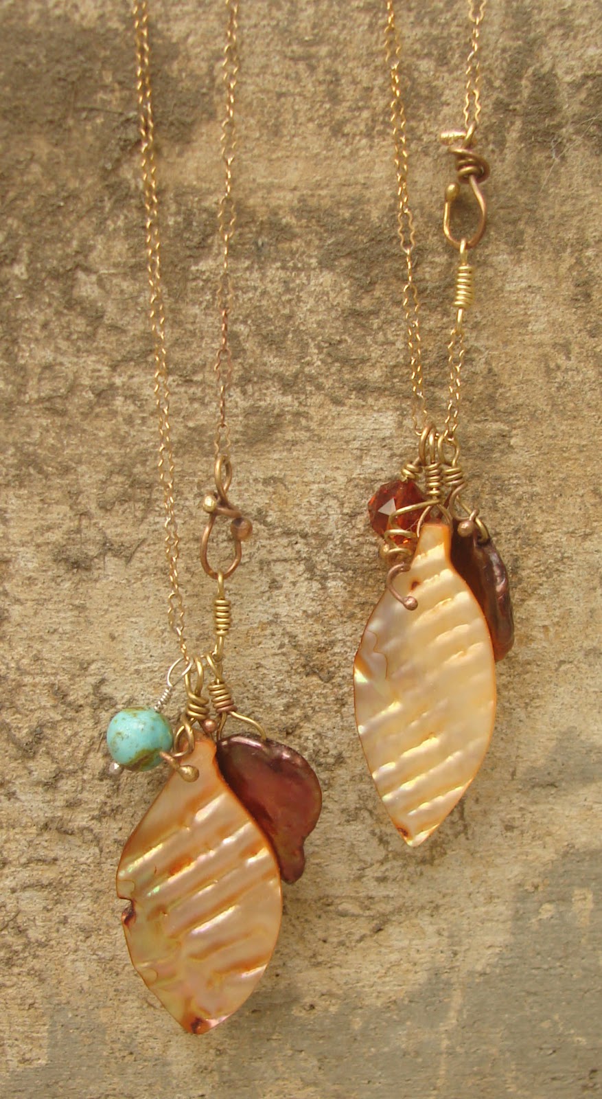 I love charms and the autumn season so I have been rummaging through my bead boxes for beads and such to make into autumn charms for necklaces. I scored the mother of pearl leaves from a round robin bead box and the vintage brass chain from Etsy. And aren't the bronze pearls awesome?